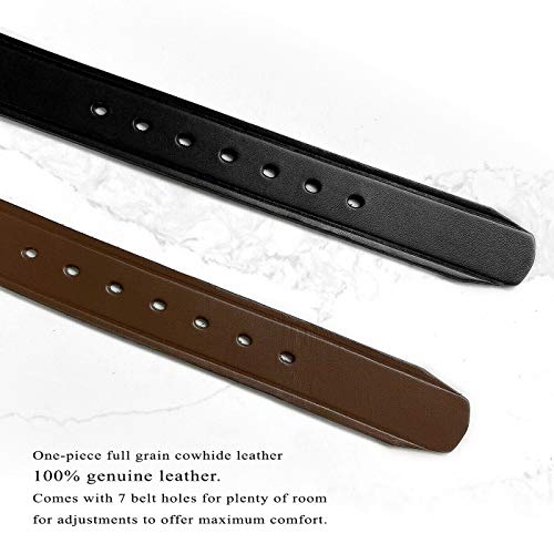 • 1-3/4"(45mm) wide one-piece full grain cowhide leather 100% genuine leather. Comes with 7 belt holes for plenty of room for adjustments to offer maximum comfort.