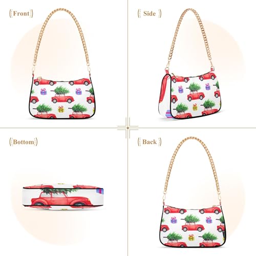Red Vintage Cars Christmas Trees Tote Handbag Womens Colorful Shoulder Bag Zipper Hobo Clutch Purse with Chain Strap 4