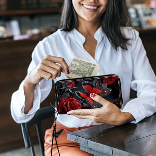 Women's Wallets,Credit Card Holder Money Leather Long Wallet with Wristlet,Large Capacity with Zip-Around Phone Purse for Women Ladies Girls,Red Butterfly Rose 7