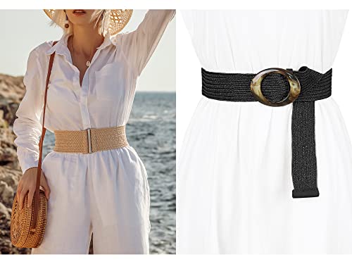 Woven Wide Stretch Belts, Straw Rattan Buckle Elastic Belts Waistband for Dress 3