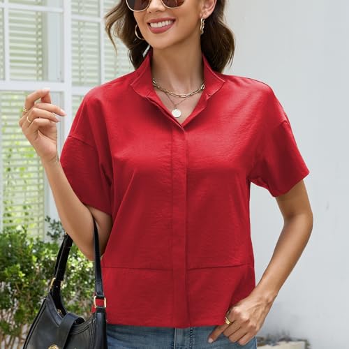 HOT ! Ainangua Women Casual Button Down Shirts Oversized Short Sleeve Stand Collar Tops Trendy Work Blouses Summer Travel Outfits(Red,S)