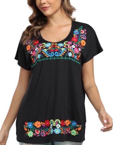 Mexican Shirts for Women Embroidered Tops Peasant Blouses Floral Traditional Summer Boho Tunic Short Sleeve Shirts 6