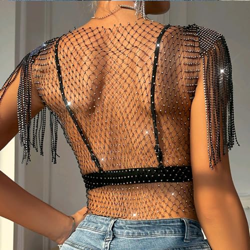 RARITYUS Women Sparkle Rhinestone Mesh Crop Top Sexy Fringe Shoulder T Shirt Hollow Out Crystal Tank Tops Party Clubwear 5