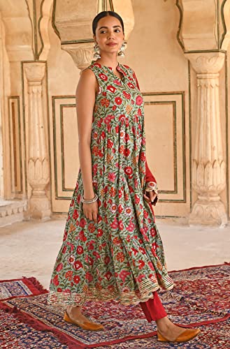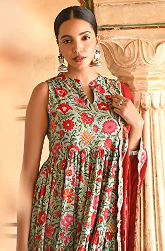 • Style:-Kurta Length: 50(inch), Bottom Length: 37(inch) | Pattern: Floral Block Print | Occasion: Casual | Type: Flared | Sleeve Type: Sleeveless | Color: Sea green