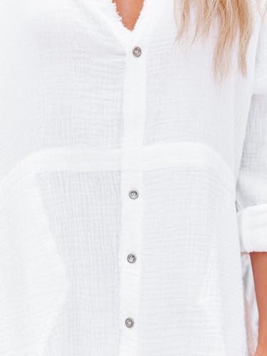 siliteelon Women's Button Down Tunic with Pockets Cotton Gauze Button Up Shirt Dress V Neck Long Sleeve Frayed Blouse Tops 1