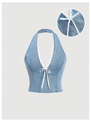 HOT ! Floerns Women's Y2k Bow Tie Denim Top Sleeveless Lace Trim Halter Neck Cute Tank Top