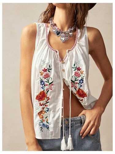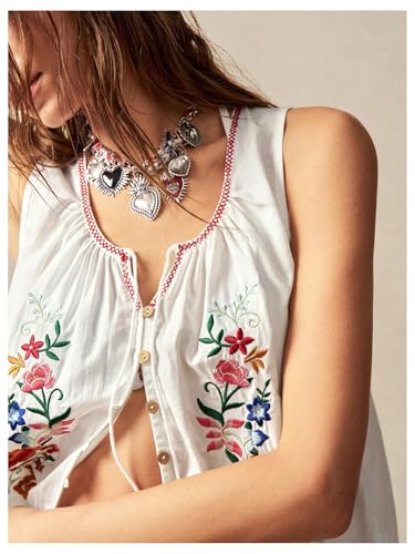 HOT ! GORGLITTER Women's Floral Embroidered Tops Y2K Sleeveless Scoop Neck Button Down Tank Top