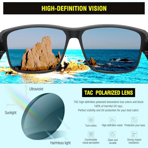 • UV400 & POLARIZED LENSES: Equipped with UV400 protection and polarized lenses, these sunglasses shield your eyes from harmful rays and reduce glare. They provide crystal-clear vision, making them perfect for outdoor activities like driving, fishing, or hiking.