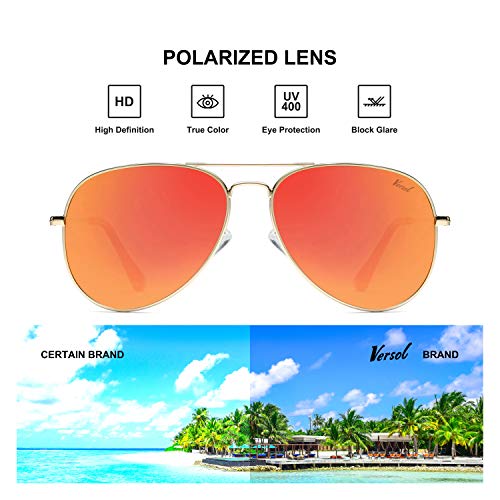 • 【Polarized Mirrored Lenses】Versol aviator sunglasses feature polarized mirrored lenses that block 100% UVA and UVB rays, eliminate glare, and restore true color. Perfect for bright outdoor environments like water, snow, and roads.