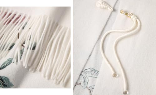 • The shawl is elegantly finished with traditional Chinese-style cord closures featuring decorative elements and accents, allowing for versatile styling options. The closure system enables the wearer to secure the shawl in multiple configurations - as a sophisticated wrap, an elegant cape, or a cozy shoulder drape. Along the bottom edge, luxurious fringe adds movement and visual interest, creating an elegant finishing touch that sways gracefully with each step.