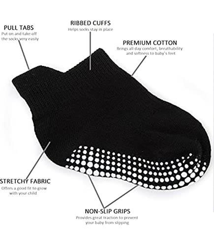 • Strong grips at the bottom covers the whole foot from heel to toe, these baby socks with grips provides great traction to help keep crawing babies and new walkers from slipping in the hard wood floors or any smooth surfaces Cotton-rich fabric offering all day comfort, breathability and softness to baby`s foot. Stretchy material provides a good fit to grow with your child. Medium thickness makes these baby anti-skid socks suitable for all seasons - with or wihout shoes