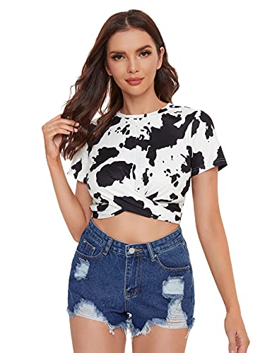 HOT ! Milumia Women's Cow Print Tee Shirt Vintage Western Twist Front Short Sleeve Crop Tank Top