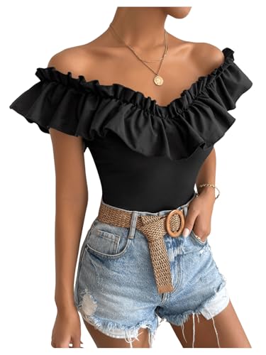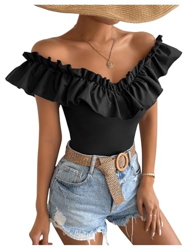 • Design: Off Shoulder,Ruffle Trim,Short Sleeve,Solid,Casual