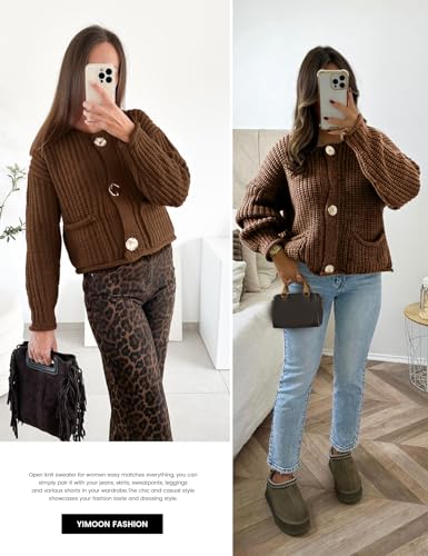 Yimoon Women's Cropped Cardigan Sweaters Button Down Chunky Knit Sweater Long Sleeve Fall Open Front Cardigan(Brown-L) 6