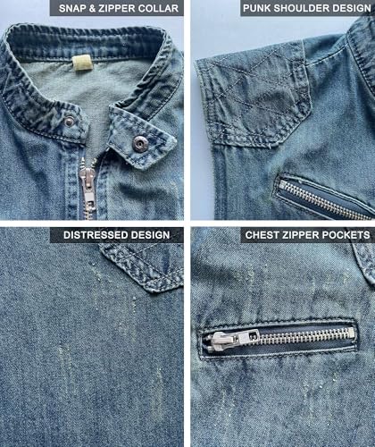 Pantete Denim Vest for Men Stand Collar Retro Zipper Sleeveless Jacket Slim Fit Cowboy Distressed Jean Vest with Pockets 5