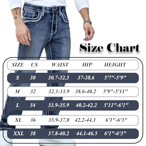 • 【SIGNATURE DETAILS】These stretch jeans men are built to last, featuring reinforced seams to prevent fraying, a smooth metal zipper fly for durability, the quality button with precision grommets for a secure fit, and embroidered back pockets or a unique style statement.