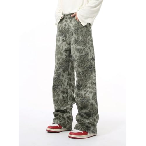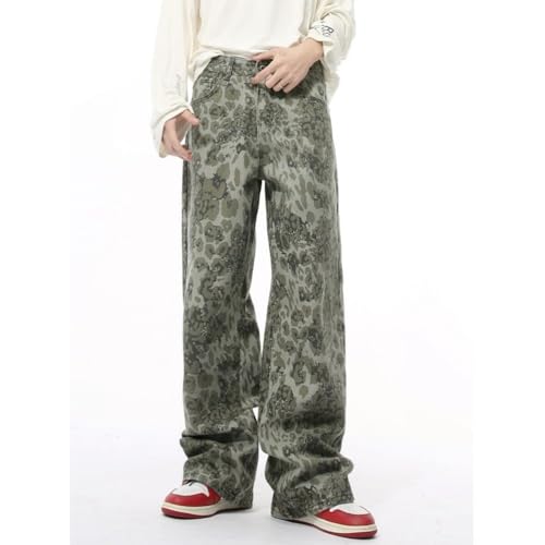 HOT ! Mens Street Style Vintage Leopard Print Mid Rise Casual Zipper Baggy Y2k Long Jeans