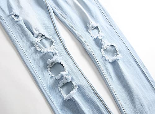 HOT ! Men's Floral Embroidered Skinny Destroyed Pants Vintage Style with Broken Holes Denim Jeans Stretch Fit Jean Trousers (Light Blue,38)