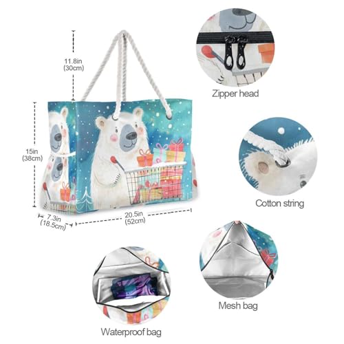 HOT ! Polar Bears Give Gifts Sandproof Tote Bag With Pockets with side pocketes Travel Bag Beach for Pool Gym Grocery Travel