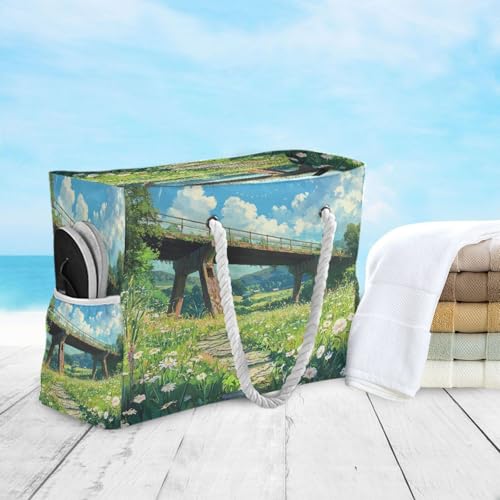 HOT ! Meadow and Bridge Beach Bag & Travel Tote Bag Large Sandproof with Zipper Closure, Wet Pouch for Swim Gym Travel, Lightweight Foldable Outdoor Bag