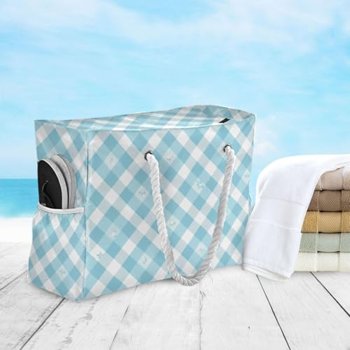 HOT ! JUNZAN Teal Blue Floral Plaid Beach Tote Bag with Handles Swim Pool Bag Beach Totes Bags for Women with Waterproof Pockets