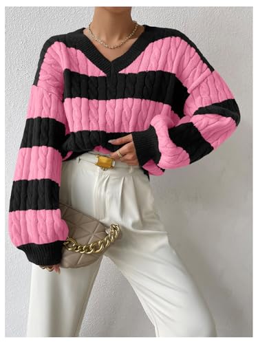 • Features: Cable knit, stripes pattern, long sleeve, v neck, color block, drop shoulder, loose fit sweater for women