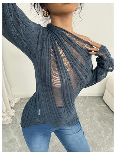HOT ! SweatyRocks Women's One Shoulder Sheer Sweater Long Sleeve Hollow Out Asymmetrical Neck Pullover Tops