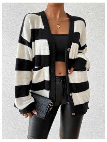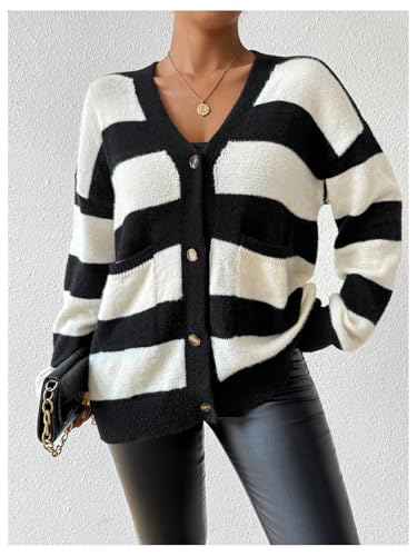 • Features: cardigan sweaters for women, striped, button down, knit, v neck, long sleeve, drop shoulder, color block, loose, pockets
