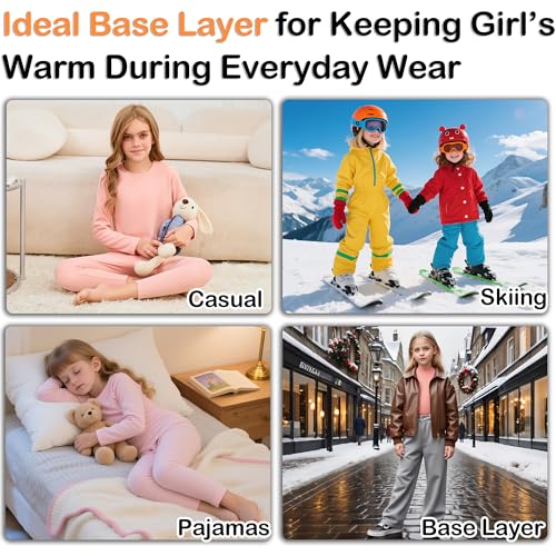 • 2 Sets Girls Thermal Underwear Set : The set includes 2 pack girls fleece lined pants and 2 pack long sleeve thermal shirts, Whether for daily home wear, school, outdoor sports, or outdoor activities such as skiing and camping, kids thermal base layer set can be easily paired with various outerwear and is an essential base layers for cold weather.