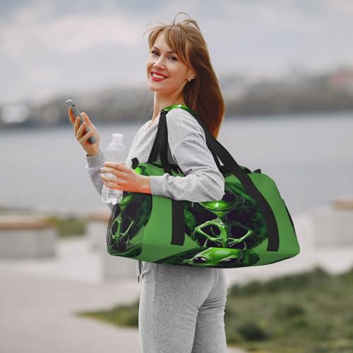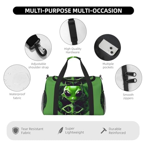 • Sturdy Composition: Green alien print Gym Bag features a firm twill material, designed to endure the rigors of various trips. Its nylon zippers and pulls are not only long-lasting but also provide a seamless operation, making it an ideal choice for both fitness and travel needs.