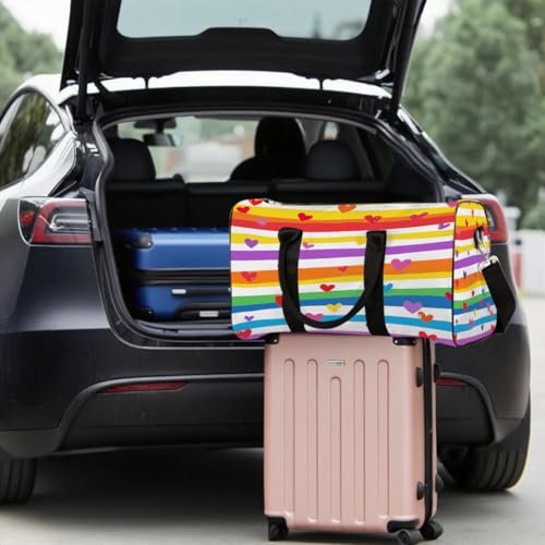Rainbow Stripe Love Heart Travel Duffel Bag Sports Tote Gym Bag Waterproof Tear-Resistant Carry On Overnight Bag Foldable Weekender Bag for Gym Travel Getaway Beach Sports 7