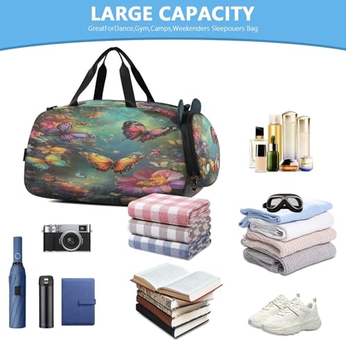 HOT ! Floral Butterfly Colorful Kids Travel Duffel Bag for Boys Girls Overnight Weekend Tote Bag with Shoes Compartment for Dance Gym Sports