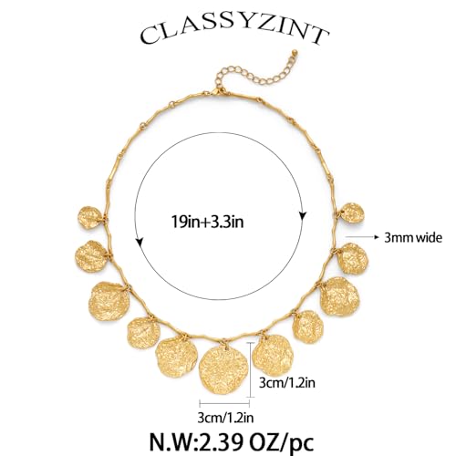 • This gold charm necklace features 11 hammered round pendants, adding texture and shine to your look. Its unique design combines elegance with a modern, trendy vibe, perfect for everyday style or special events.