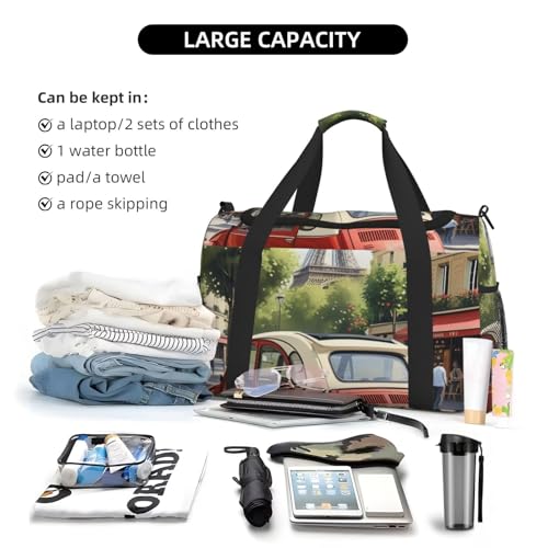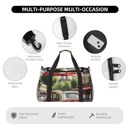 Paris Postcard Print Travel Duffle Bag - Foldable Personal Item Travel Bag for Women & Men,Carry-On Convertible Crossbody Tote Bags with Adjustable Shoulder Strap & Pockets 13x10.2x19.7 in 1