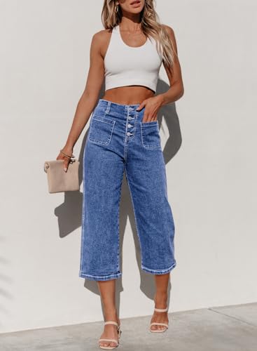 Sidefeel Women's Capri Pants Trendy Wide Leg Jeans High Waisted Stretchy Loose Cropped Denim Pants 1