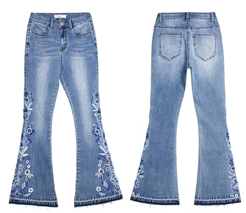 Andongnywell Womens Floral Embroidered Bell Bottom Jeans Chic High-Rise Printed Flare Jeans Long Denim Pants 7