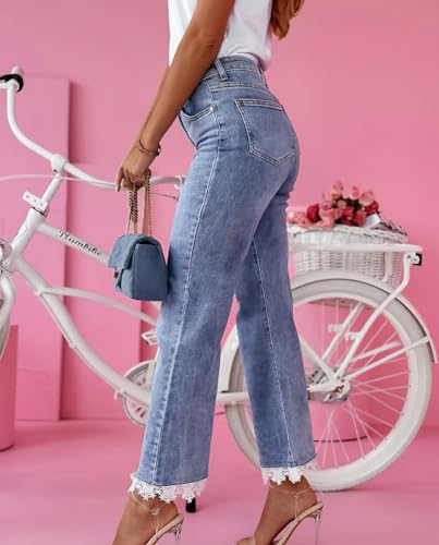 Womens Ankle Flare Jeans High Waist Lace Trim Bell Bottom Stretchy Ankle Jeans Wide Leg Short Denim Flare Pants 6