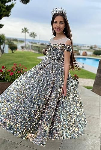 Sequin Flower Girl Dresses for Wedding Off Shoulder Sparkly Pageant Dress for Girls Ball Gown Kids Dress 6