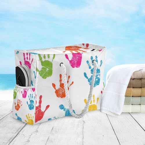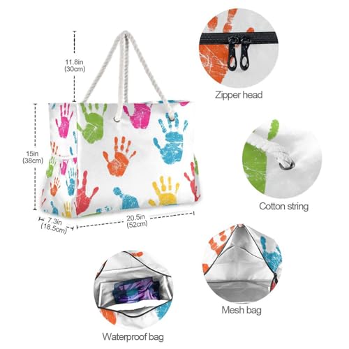 OTVEE Colorful Handprint Patterns Beach Bags for Women Ladies Large Canvas Tote Shoulder Bag Waterproof Travel Bags for Gym Swim Pool Camping 4