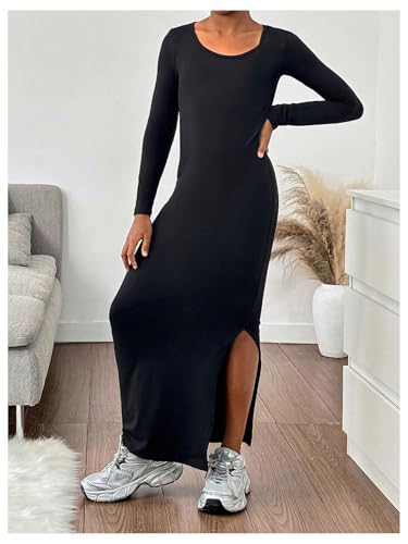 COZYEASE Girl's Bodycon Fitted Side Slit Dresses Long Sleeve Round Neck Maxi Dress 1
