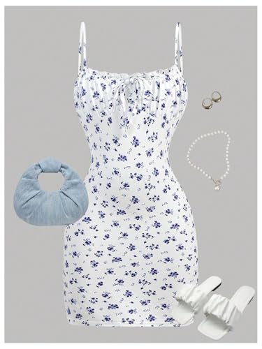 HOT ! Verdusa Girl's Floral Bowknot Bodycon Short Dress Boho Ruched Spaghetti Strap Dresses