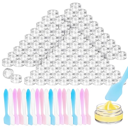 MotBach 200 Pack 5g Plastic Jars with Lids, 5ml Round Clear Cosmetic Containers Makeup Jars, 5gram Travel Size Container Jar with Spatulas for Makeup Sample Lotion Cream Ointment Salve Balm Powder 3