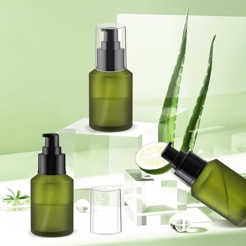 4 Pcs 60ml/2oz Green Frosted Glass Bottles Refillable Pump Dispenser Jar Empty Lotion Vials with Pump for Travel Body Wash Liquid Foundation Cosmetic Samples 6