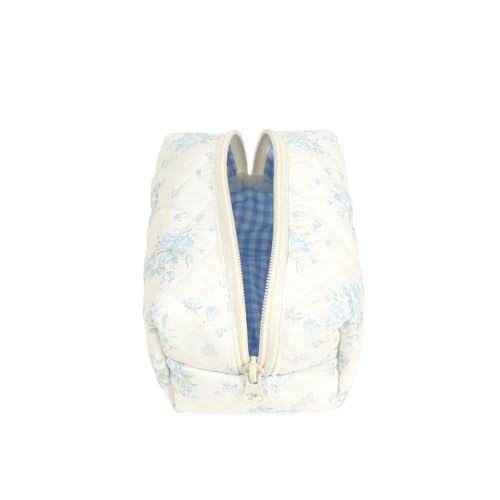 2Pcs Mini Floral Quilted Makeup Bag set,Cute Cosmetic Bag for Women and Girls,Travel Coqutee Aesthetic Organized Bag (blue and white) 2