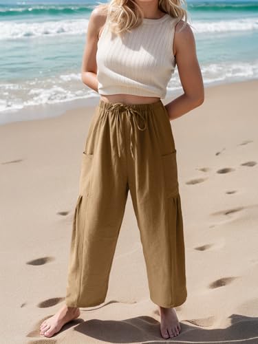 HWOKEFEIYU Women Wide Leg Pants Summer Casual Low Waist Loose Drawstring Harem Pants Beach Palazzo with Pockets 6