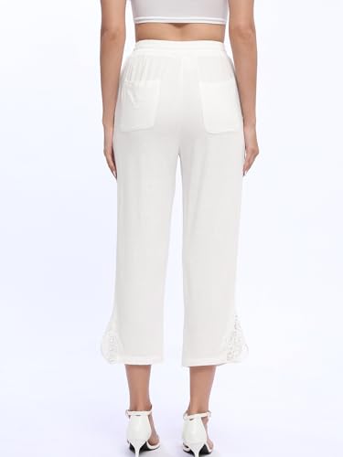 Women Casual Capri Pants with Lace Detail, Linen Blend Pants Cropped Trousers for Summer 2