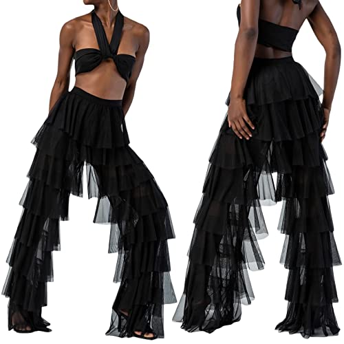 HOT ! Women's Tiered Ruffled Tulle Pants Cover Up Pant Sheer Layered Tulle Loose Long Trousers Layered Pants