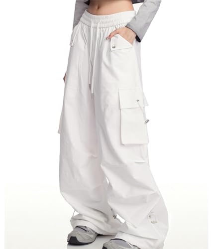 SANGTREE Women's Drawstring Elastic Waist Ruched Baggy Cargo Pants Hip Hop Streetwear, White, X-Large 1