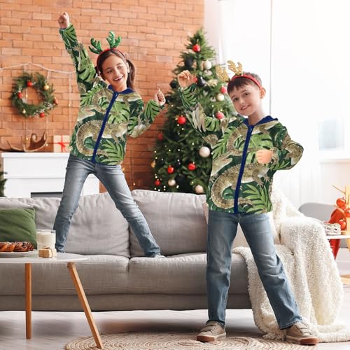 Crocodile and Leaf Pattern Print Toddler Fleece Jacket Girl Boys Hooded Fleece Jacket Coat Warm Outwear Zip-up 3-10T 4