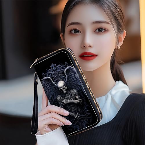 More information about Skull with Wings Print Women Large Capacity PU Leather Double Zipper Wallet, Multifunctional Clutch Purse for Cash/Card/Coin/Smart Phone